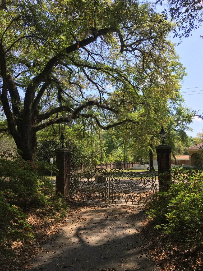 The gates to Kalmia Gardens. Camellias are featured in the wrought iron gates since they were Miss May’s most favorite flower.