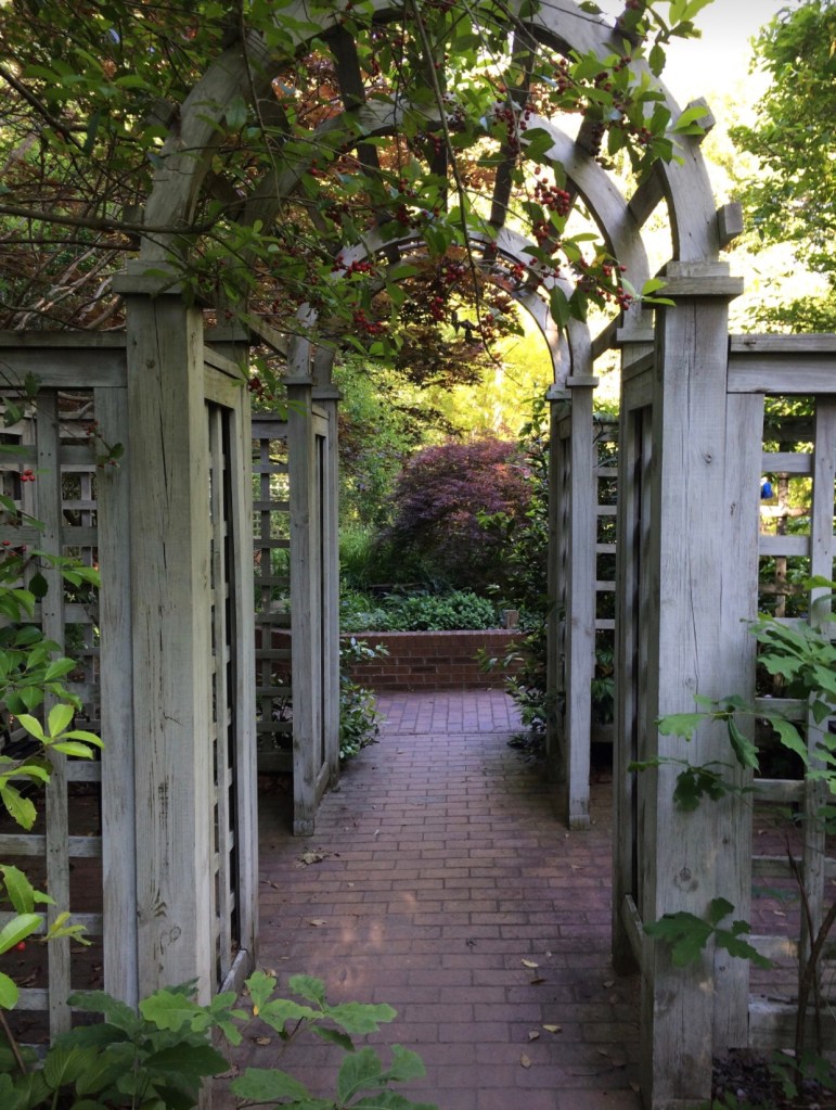 An archway leading into a garden.