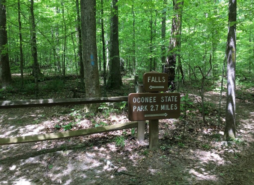 If you begin your walk at Oconee Station, you will have a 1.5 mile walk to get to the falls. You will pass by a pond before you cross over the highway to get on the trail to the falls. Or, if you are lucky, you can park at the kiosk that is at the trailhead for the falls, and take a hike that is only 0.5 miles from the parking area. I parked at the kiosk both times I have hiked the trail, so I really can’t compare the two different hikes. The parking lot at the kiosk is rather small, so only between four to six cars could be parked there safely.