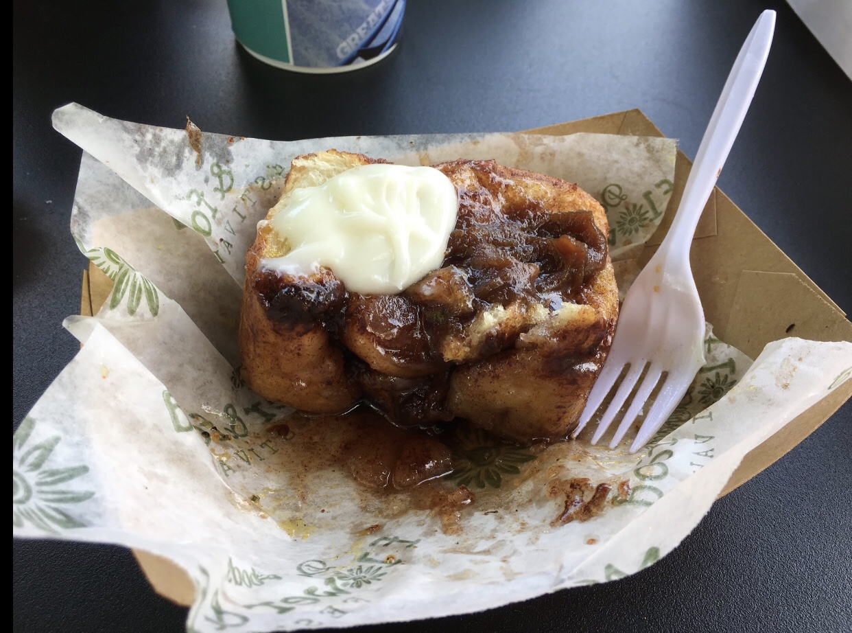 After waiting in line to ride the Dollywood Express, we were sadly not able to board the train. Due to having to social distance everyone on the rides, the people ahead of us were able to board, and at that point, the train was full. The gate was closed, and the next train would be leaving in an hour. I personally am not going to wait an hour to do anything, especially if I have the opportunity to return again one day in the future, so I told my mom that we would just catch the train on our next visit there. We decided that we would finally go eat lunch. We did stop by and get some of the famous cinnamon bread that we have heard so much about. I got the extra icing and apple butter to go along with it. The bread was given to us in a paper bag, and I could tell that it had just been taken out of the oven.